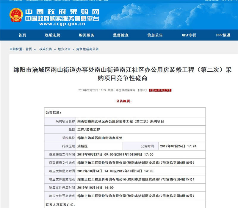 【綿陽正信·招標部消息】我公司受綿陽市涪城區南山街道辦事處委托,對南山街道南江社區辦公用房裝修工程(第二次)采購項目掛網采購,該項目于2019年09月26日在中國政府采購網掛網公示,預計于2019年10月14日14:00在綿陽正信工程造價咨詢有限公司開標室開標。