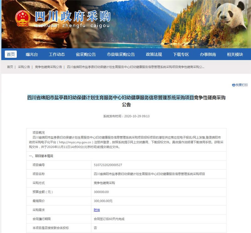 【綿陽正信·招標(biāo)部消息】我公司受四川省綿陽市鹽亭縣婦幼保健計(jì)劃生育服務(wù)中心委托,對四川省綿陽市鹽亭縣婦幼保健計(jì)劃生育服務(wù)中心婦幼健康服務(wù)信息管理系統(tǒng)采購項(xiàng)目擬采用競爭性磋商方式進(jìn)行采購,本項(xiàng)目于2020年10月29日在四川省政府采購網(wǎng)、綿陽市政府采購網(wǎng)公示,預(yù)計(jì)于2020年11月11日14:00在綿陽市安昌路17號富臨花園四樓15號開標(biāo)。